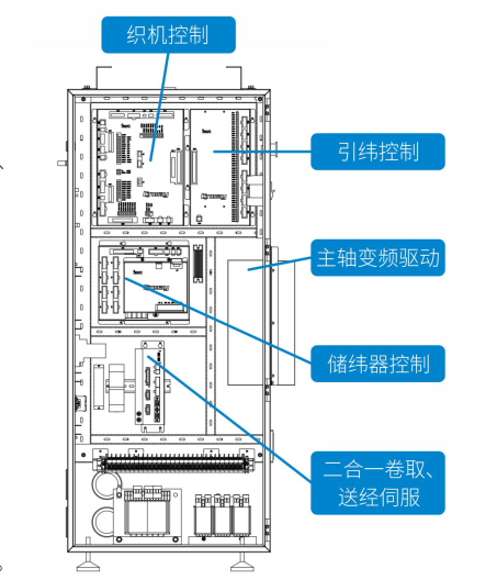 AS1000 喷气电控系统提供了织机电气部分的整体解决方案。集成织机控制系统、主轴变频驱动、电子卷取送经、储纬器控制、引纬控制系统的一体化智能控制系统。