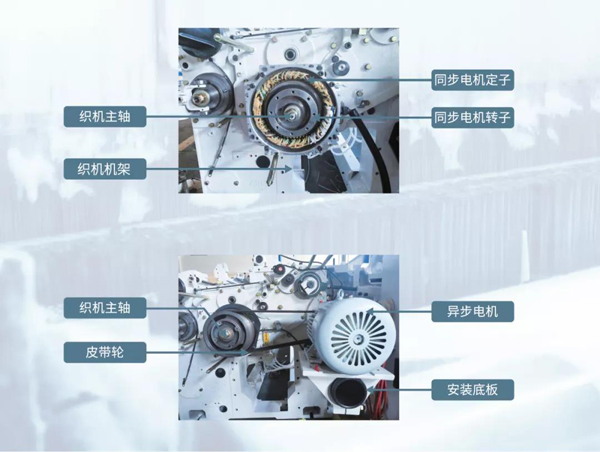 该系统主要用于驱动喷水、喷气织机主轴,采用高能效永磁同步直驱电机及GD350-12系列专用变频驱动器,电机转子直接安装在织机主轴端、定子安装在织机机架上,省去了原电磁刹车盘、异步电机安装底板及皮带轮,实现真正直驱方案。