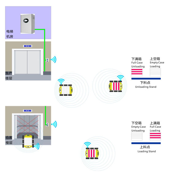 方案简述: ● AGV与HOP进行无线数据通讯 ● HOP接收AGV数据,并将数据上传电梯智能整体机 ● 电梯智能整体机根据上传的AGV数据,判断AGV位置,安排派梯 ● AGV通过HOP与电梯智能整体机进行数据交换,执行自动出入电梯