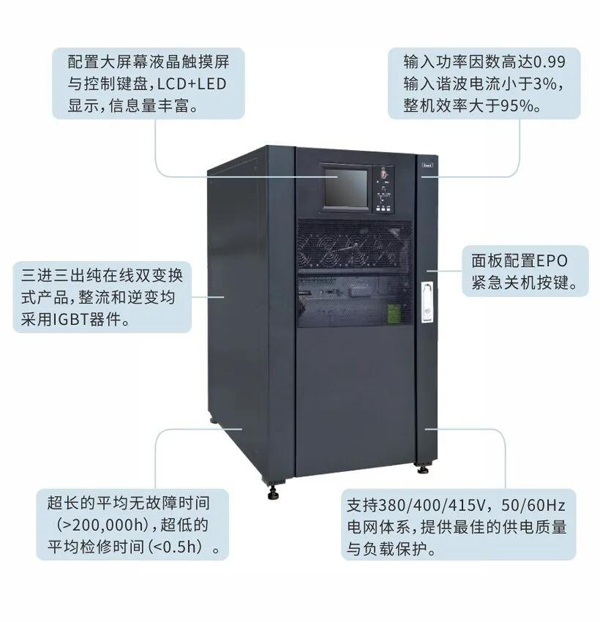 创新的设计使得此系列产品拥有无与伦比的可靠性与高性能。极高的输入功率因数和极低的输入电流畸变率保证了产品的绿色与环保性,极高的整机效率保证了产品的节能性。此系列产品可以6台机器直接并联运行。