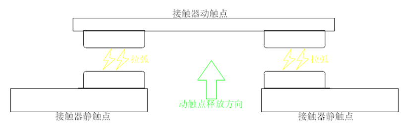 这是因为在变频器驱动电机时,运行接触器突然断开,接触器要切断大电流,在这瞬间接触器触点间产生拉弧(图3),而电弧使电流继续流通直至接触器触点完全断开电弧熄灭,而此时,接触器的常闭触点开始接通,导致变频器输出瞬间短路(图4)。