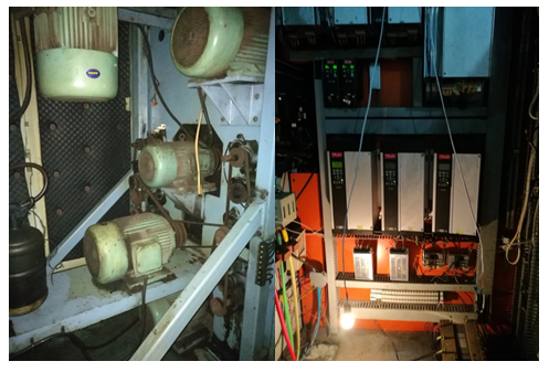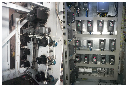 本案应用在JWFK6-10C经纬化纤2007年12生产的加弹机,我们对车头和车尾传动进行改造升级,皮带传动改成直连传动。采用高效同步电机与变频一对一驱动方式。同时更换整个控制系统,包括PLC控制系统、加热控制。