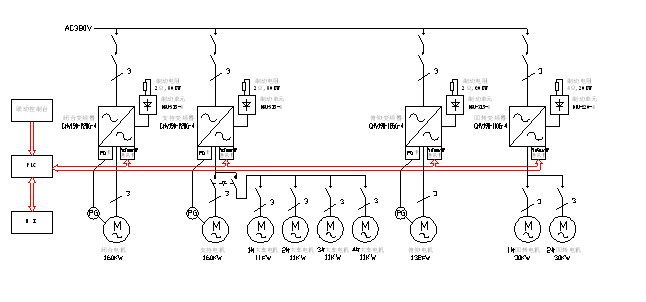 大车运行机构由4台11KW变频电机驱动,和支持机构共用一台变频器通过切换分别控制,其中一组电机需要控制运行时,变频器接收到转换信号后自动切换到相应电机组参数。