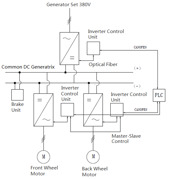 在AGV设备中,由柴油发电机产生三相交流电,然后被馈送到PWM整流器。整个车辆由两台变频器通过降速控制进行驱动,其中,一台变频器驱动前轮,另一台驱动后轮。两台变频器分别由主从控制,主控制用于速度控制,从控制用于转矩控制,设定一定的降速频率后,电源实现平衡。电机的额定电压是440V,柴油发电机的电压为380V, PWM整流器的电压上升之后,交流电压为440V。为了避免对柴油发电机产生不良影响,需要配备能量回馈功能,通过制动单元来消耗电机减速的回馈能量。车载PLC可通过CANopen通讯来控制变频器和整流器。