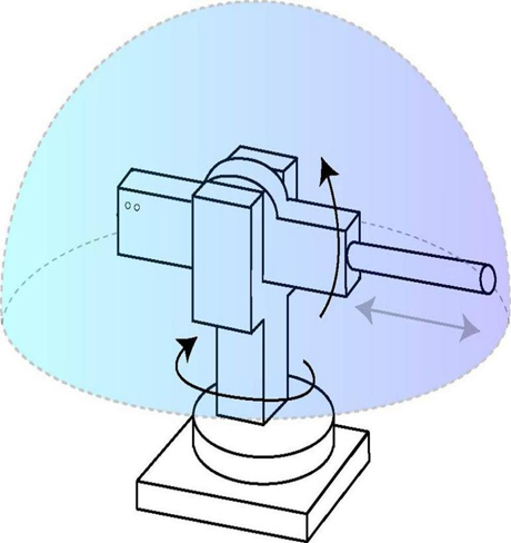 如图1所示,机器人由一个回转和两个平移所组成。整个立柱可以旋转,手臂可以沿着立柱上升或下降,而且手臂可以伸长或缩回。使旋转半径随工作的要求而变化。
