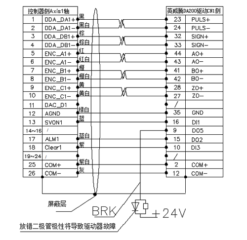 接线要求:系统到驱动器连接要求采用双绞 2*8 屏蔽电缆,抱闸系统电缆采用 1*2 屏蔽线连 接到抱闸制动板上,外壳要与屏蔽层连接良好。控制器侧的 AGND 必须跟伺服 的 GND 连接,否则可能会造成控制器硬件损坏。