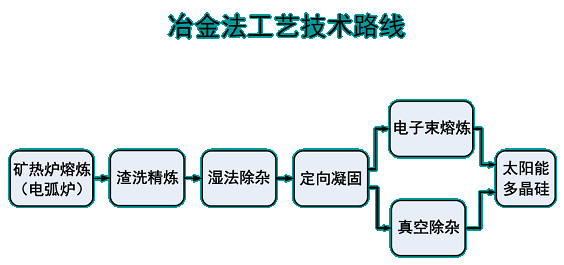 冶金法又称物理法,通过对冶金硅原料进行造渣、精炼、酸洗(湿法冶金)、定向凝固等方式,将杂质去除,生产出太阳能级的多晶硅的方法。由于硅不参加化学反应,所以俗称物理法。其实整个生产过程中,无论是造渣、精炼还是酸洗,都不可避免地涉及到化学反应。冶金法提纯多晶硅路线类似于冶金工业中金属提纯工艺,尽可能的采用物理方法去除杂质。由于没有行业内通用的成熟技术可以借鉴,各公司均自主研发工艺路线,具体的工艺方法各有不同。冶金法提纯多晶硅包括吹气精炼、溶剂精炼、定向凝固、真空精炼、熔盐电解等多种方法。在提纯的过程中主要利用不同元素的物理性质差异来使之分离,其中包括湿法冶金、吹气、造渣、定向凝固、真空条件下的电子束、等离子体、太阳聚光及感应熔炼等。上述方法中单一的一种方法只能有效去除某一些杂质而不能去除所有杂质,所以冶金法工艺是一种综合多种方法的复合提纯工艺。其主要技术路线如下图所示: