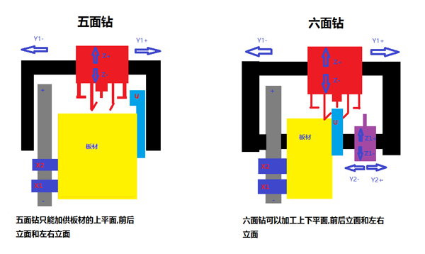 数控六面钻的主要工作原理是,编程技术人员将待加工板材的图纸转换成NC程序传入运动控制系统,控制上下刀库和主轴以及各个进给轴伺服运行。
