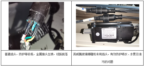玻璃精雕机加工精度高、机器稳定、成品精细、加工速度快、生产效率高,且玻璃有易碎、易损伤等缺点,要实现对玻璃的精细加工,伺服系统必须精度高、响应快、同步性好。玻璃精雕机在工作的时候会在加工位置浇注切削液,切削液有一定的腐蚀性,且含有油成分,在高速铣刀下切削液会形成水雾,如果伺服电机、伺服驱动器和伺服线缆防护不好,水雾会腐蚀伺服系统,且伺服驱动器内会形成油污,造成伺服工作故障。所以伺服系统防护等级、可靠性要求高。