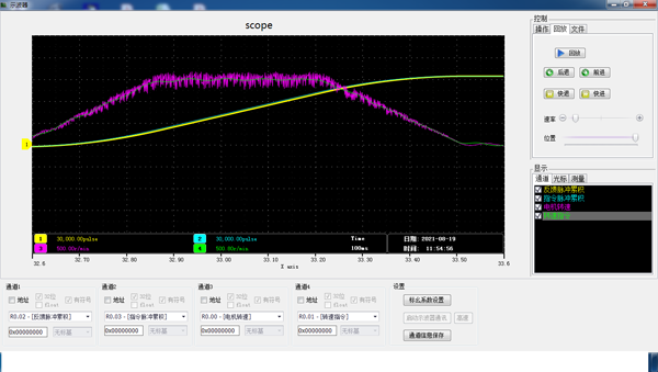5、易调试指导: 调试过程中,送料伺服先不接全闭环编码器,先设定伺服系统的基本参数,电机无报警后,接入全闭环编码器。低速运行全闭环系统,观察指令脉冲与反馈脉冲之间的关系,观察指令速度与反馈速度之间的关系,波形图符合如下:
