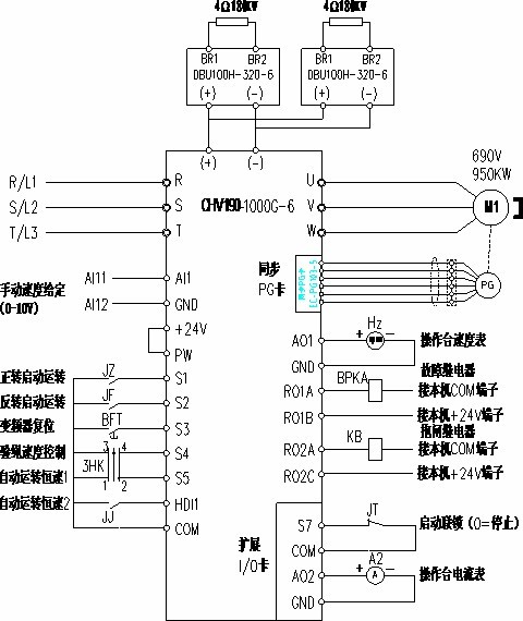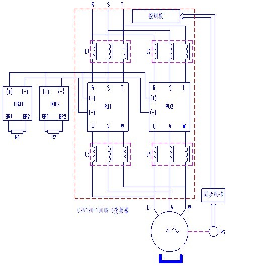 --传动系统方案如图2所示,变压器二次侧690V三相交流电源经隔离开关、熔断器、接触器、输入电抗器提供给变频器,CHV190-1000G-6变频器采用并机方式,即由2台690V500KW变频器并机组成,每台变频器均配置输入、输出电抗器,与电动机同轴安装UVW型同步电动机专用编码器。电气制动采用2台DBU100H-320-6能耗制动单元;每台制动单元连接4Ω180KW制动电阻。