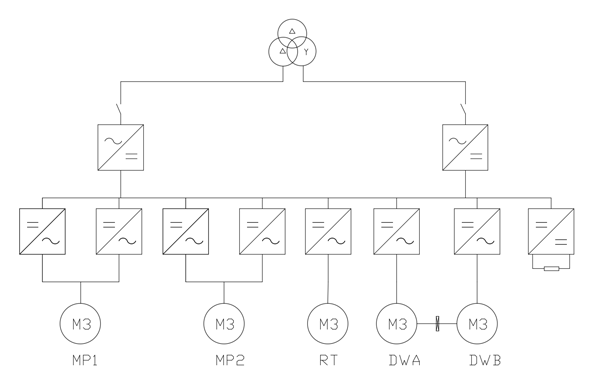 由于本系统设计为网电钻机,因此主回路整流部分采用12脉冲整流方案,并配置有源滤波装置,以低输入侧谐波,满足电网要求。