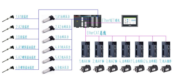 3、出胶压力泵和机头搅拌器采用伺服驱动,且出胶压力由总计6个高精度压力传感器反馈控制出胶稳定精确。