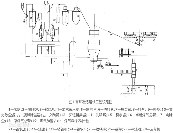 高炉冶炼过程是在炉料和炉气的反向运动中进行传热、传质和机械运动。炉料均匀而有节奏地下降,反应产生的煤气合理分布上升从炉顶泄出是高炉顺行的首要要求。焦炭在风口燃烧,焦炭被炉料中的氧氧化,在炉料下降过程中小块料填充于大块料之间,炉料逐渐熔化使体积缩小,定期从炉缸排放炉渣与合金等都会在炉内形成自由空间。炉料由于自重克服炉料与炉壁、炉料间的摩擦力和煤气上升的浮力而下降。锰铁高炉炉缸温度比生铁高炉高,炉料软熔带相对上移,气体通道切面相对变小,气流速度变大,阻力损失增加,对高炉的顺行影响甚大。煤气流的合理分布对高炉冶炼锰铁十分重要。所以高炉鼓风机是整个炼锰工艺中的最关键设备。