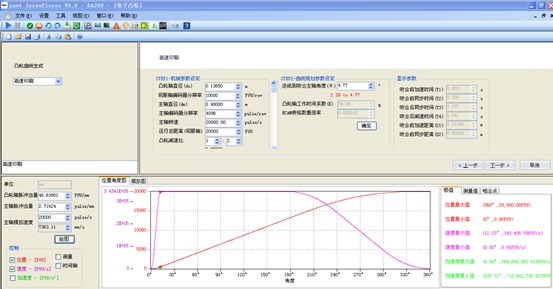 凸轮轴直径(ds)=0.1365m; 主轴直径=0.48m; 主轴编码器分辨率=4096; 运行总距离(伺服轴)=20000PUU; 凸轮减速比=1: 2; 加速距离(S∑)=0.01m; 设置结束点击确认!