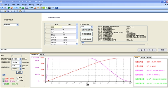 凸轮曲线点数选择1000点,点击重新建立表格,点击右下角绘图键!点击下载到控制器。烧写结束请将参数P7.18=0,并将伺服重启或者上位机软件重启。