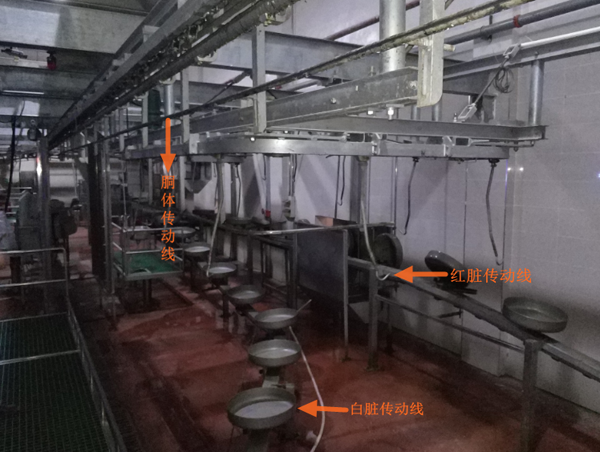 在生产过程中,被开膛的猪胴体经过胴体传送链条时,会挂在传动链条上,输送到操作台,此时会与白脏线同步定位,操作工人将白脏切下,放入托盘中。胴体会一直往前输送,到达红脏挂钩处,工人将红脏切下,挂在挂钩上。这三条线在生产过程中要实现位置的同步运行,这样才能保证生产线的高效稳定的生产,提高生产效率。
