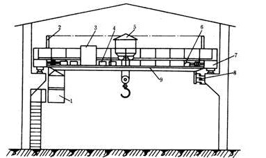 1.桥架:由主梁。端梁。走台等几部分组成。2.大车移行机构。3.小车。4.提升机构。5.操纵室。