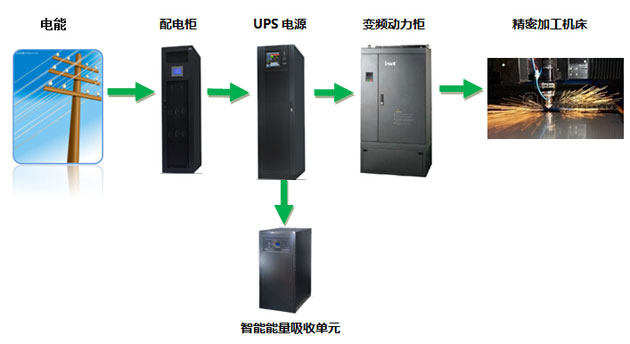 在精密机械加工行业广泛应用的汽车、航空、轨道交通、精密仪器设备等高端领域,为保证加工精度以及昂贵胚料的安全,加工设备对供电质量有着极高的要求。对于普通配置的UPS电源来说,变频器在拖动电动机正反转时,电动机惰走时的动能转换成电能回馈到电网,其回馈能量的冲击,导致UPS频繁切换到旁路,失去了UPS的保护作用,甚至会对UPS本身造成伤害,致使加工设备得不到有效的保护,造成加工刀具的损坏和胚料的报废。